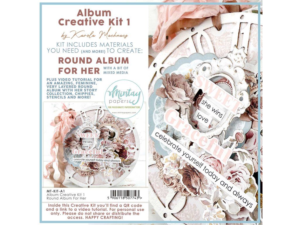 Tato tvůrčí sada vás vezme za ruku a krok za krokem provede vytvořením nádherného kulatého alba plného ženské elegance – od první vrstvy gessa až po poslední ozdobu. Nemusíte nic vymýšlet ani shánět: v balení najdete všechny materiály Mintay Papers, exkluzivní video tutoriál od Karoly (přístupný pouze majitelům sady přes QR kód) a navíc i materiály, které využijete na další projekty. Naučíte se techniky smíšené techniky, práci s chipboard základnou, velkými papíry 12×12 i šikovné triky s klapkami a fotoprostory. Výsledek? Promyšlený, osobní dárek, který vyvolá slzy dojetí – ne proto, že je dokonalý, ale proto, že je od vás.