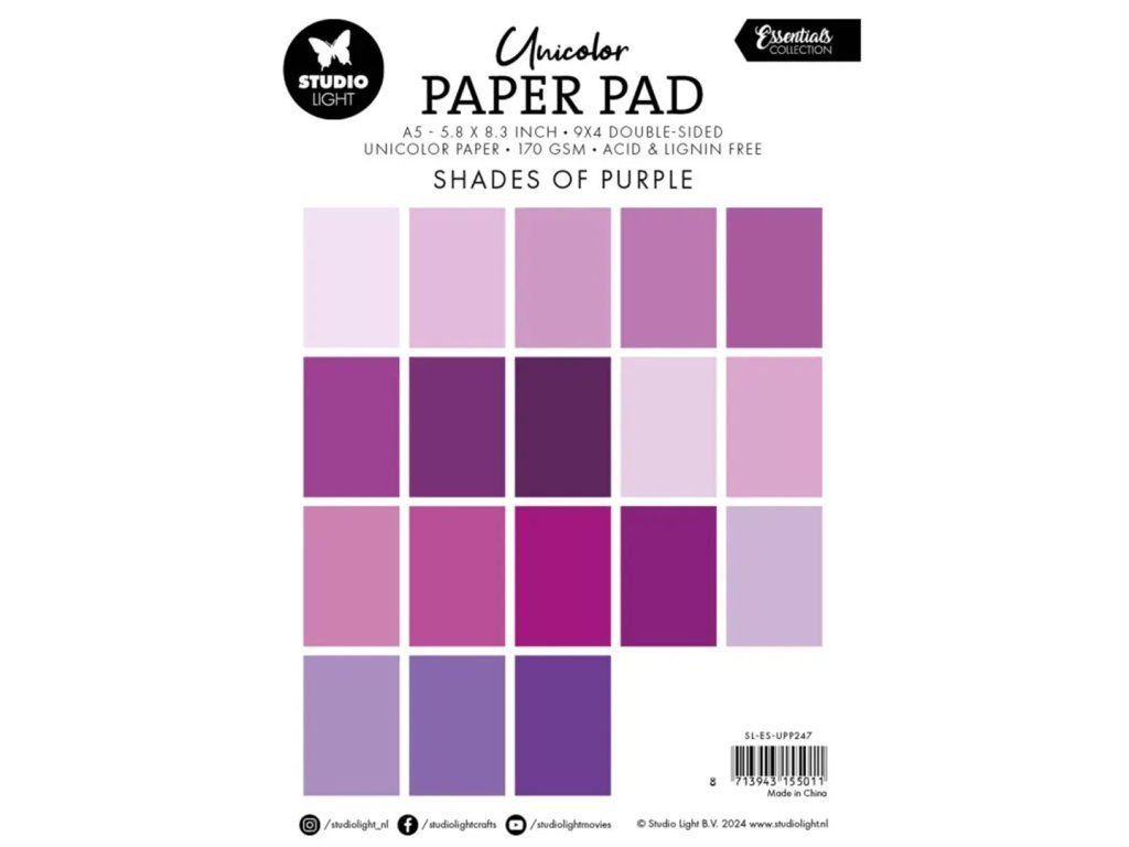 Blok formátu A5 (14,8 x 21 cm) má matný tisk a celkem 18 barev po 2 kusech. Papír neobsahuje kyselinu ani lignin – ty v obyčejných papírech způsobují žloutnutí a křehnutí. Díky výrobnímu procesu značky Studio Light , který zahrnuje odstranění těchto látek si můžete být jisti, že vaše výrobky zůstanou kvalitní a zářivě barevné podstatně déle.