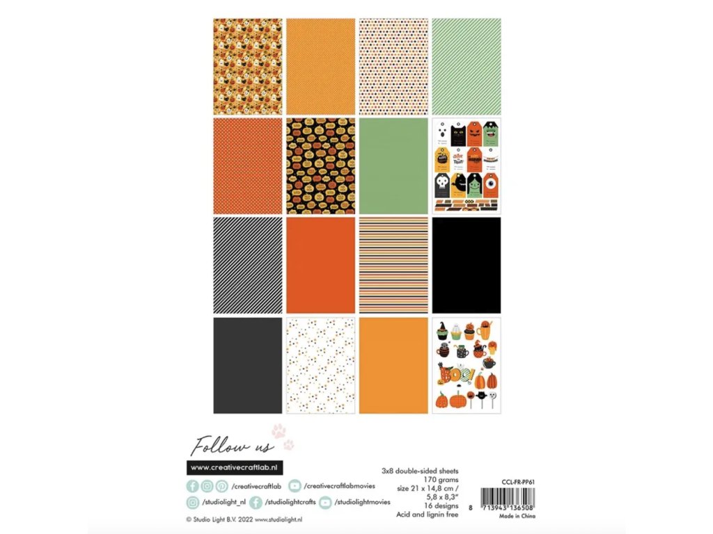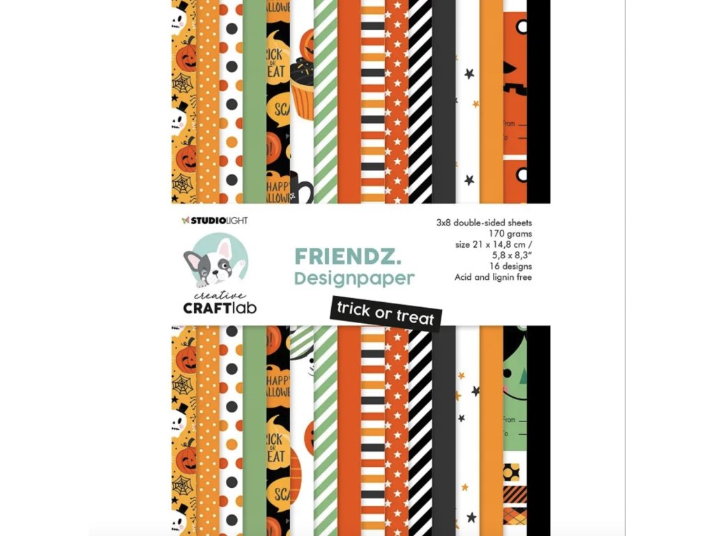 Blok vzorovaných papírů s halloweenskými vzory ve veselých barvách. Papíry využijete na scrapbooking, cardmaking a další výrobky z papíru. Sada obsahuje 24 listů (3 x 8 designů) ve formátu A5 s matným oboustranným potiskem. Papíry jsou bez kyseliny a neobsahují lignin, gramáž 170 g/m2.