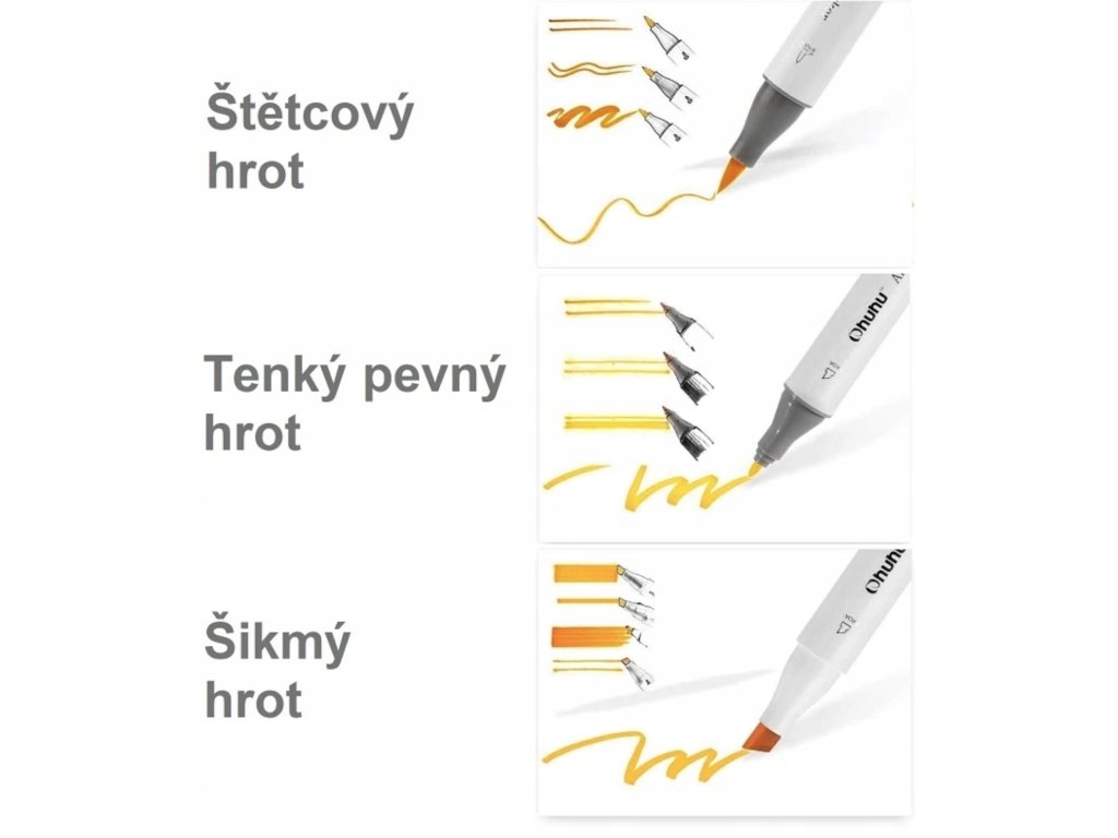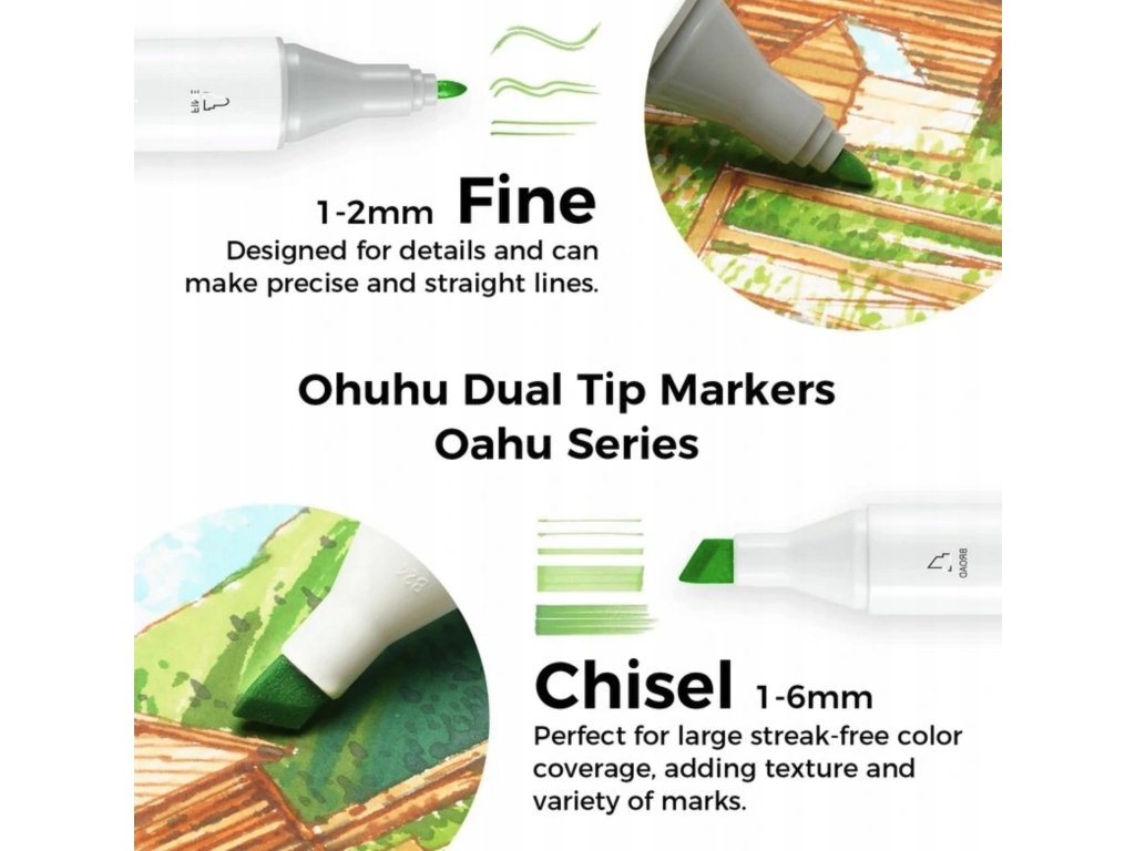 Objevte radost z tvoření bez kompromisů. Oboustranné lihové fixy OHUHU vám přinášejí profesionální výsledky za zlomek ceny prémiových značek. Tenký pevný hrot pro jemné detaily, šikmý chisel hrot pro plošné pokrytí – dva nástroje v jednom fixu.