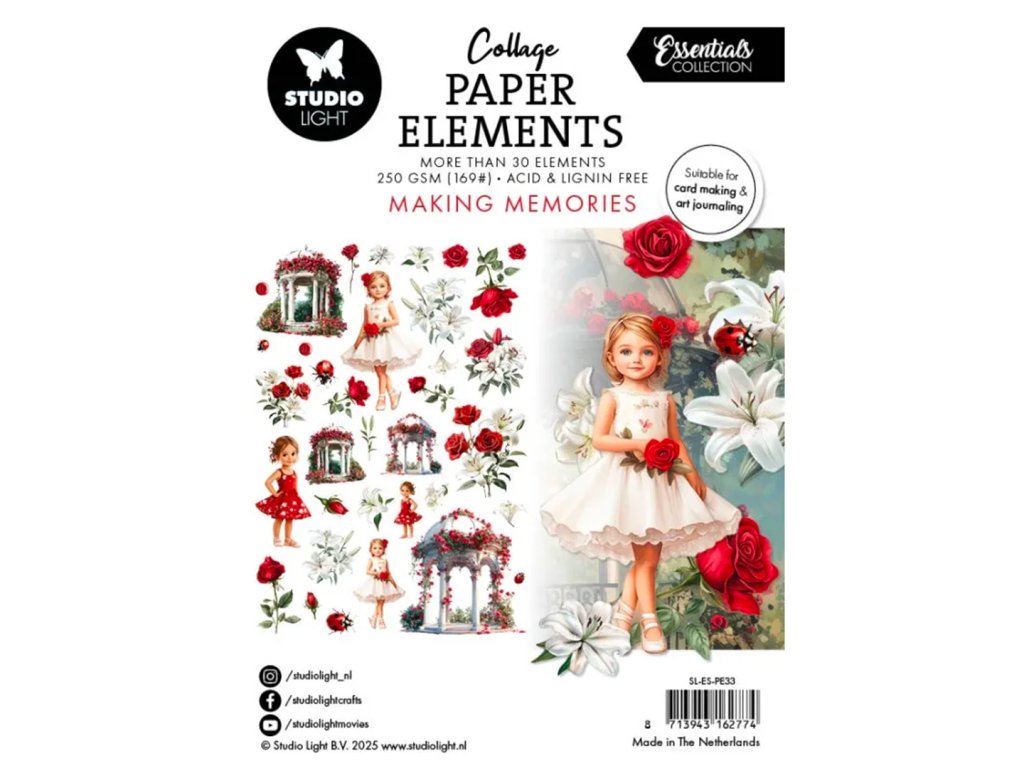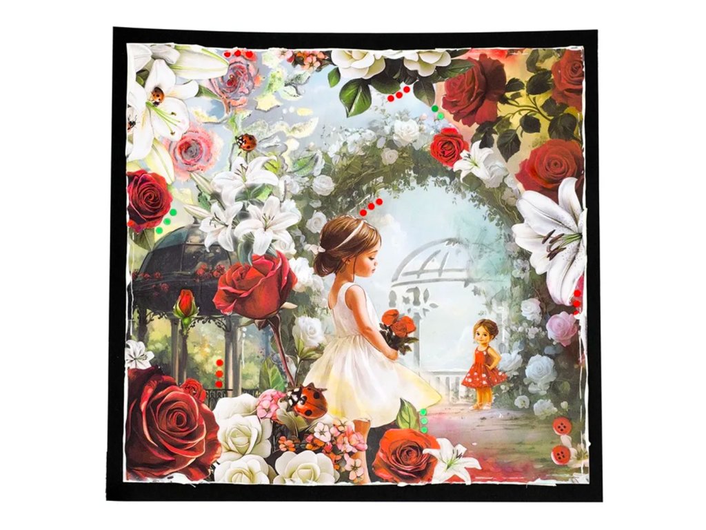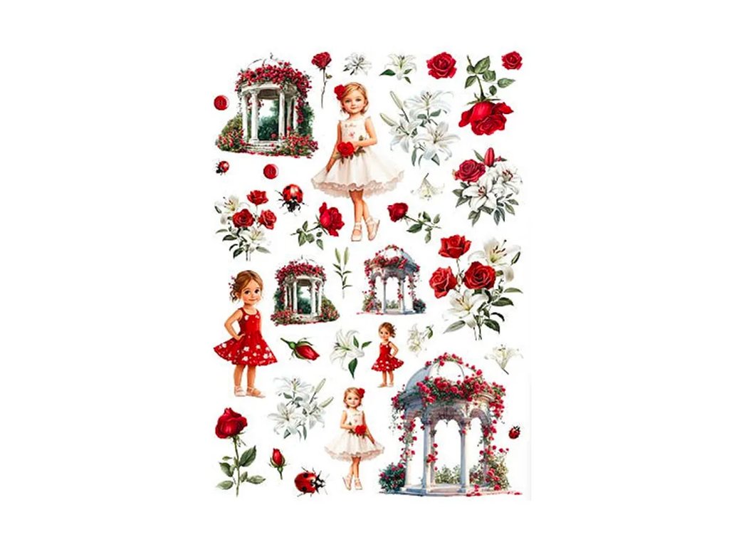 Sada dekorativních papírových výseků s motivy růží, romantických altánků a sladkých holčiček určených převážně k papírovému tvoření. Obrázky jsou obzvláště vhodné ke kolážování, na stránky art journalu nebo na cardmaking – výrobu přání. Žádný z motivů není třeba vystřihovat, stačí jen nalepit na projekt pomocí tekutého lepidla , lepicí pásky nebo lepicích 3D polštářků.
