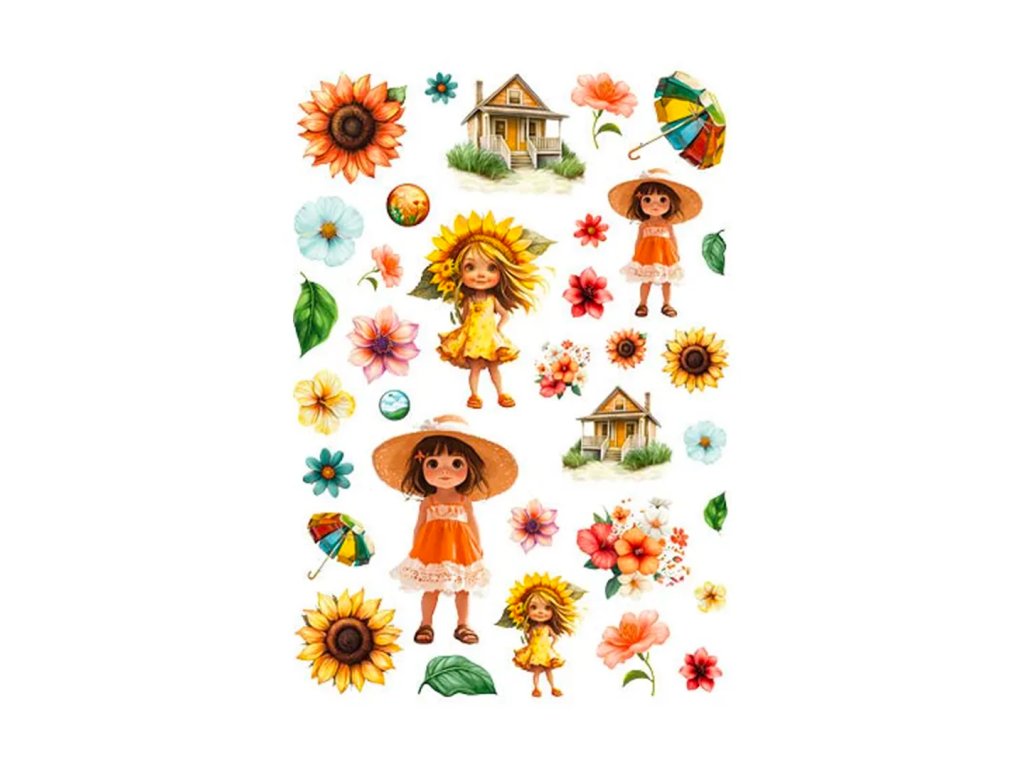 Sada dekorativních papírových výseků s motivy letních květin, domů a sladkých holčiček určených převážně k papírovému tvoření. Obrázky jsou obzvláště vhodné ke kolážování, na stránky art journalu nebo na cardmaking – výrobu přání. Žádný z motivů není třeba vystřihovat, stačí jen nalepit na projekt pomocí tekutého lepidla , lepicí pásky nebo lepicích 3D polštářků.