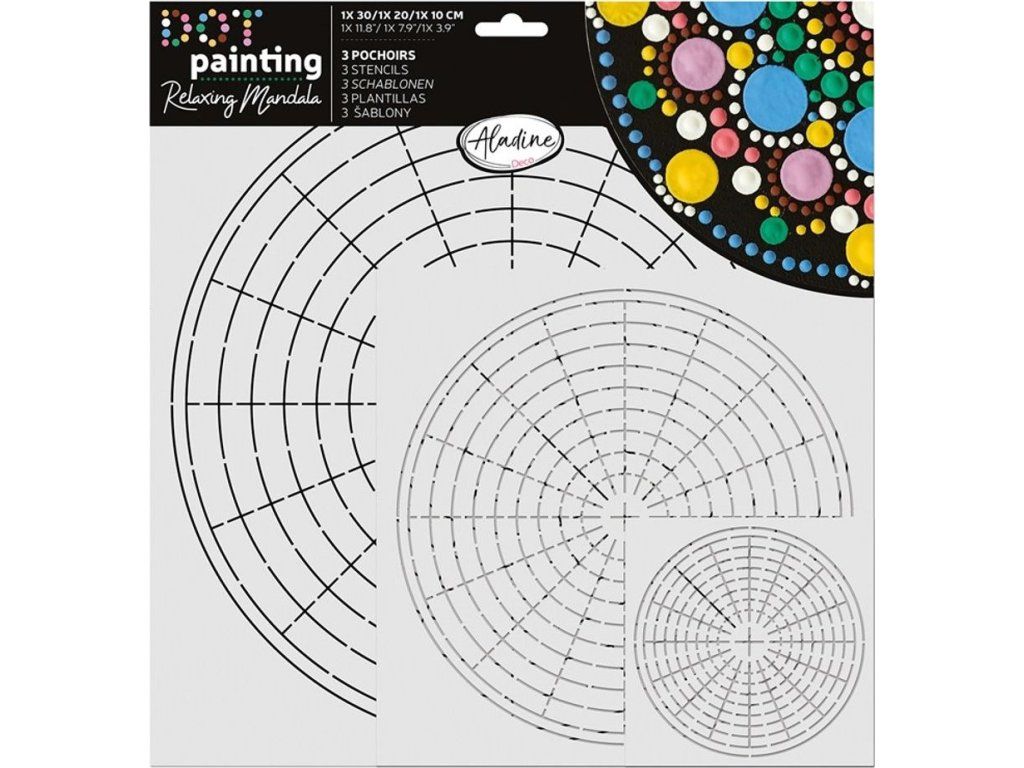 Sada plastových šablon slouží jako opakovatelně použitelná předloha pro tvorbu mandal na jakémkoli povrchu, ideální pro techniku tečkování . Už žádné sáhodlouhé rýsování s pravítky, úhloměry a kružítky, jen volné tvoření!