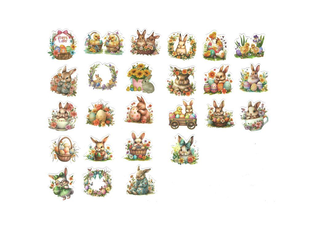 25ks samostatně vyříznutých samolepek na bílém papíře s velikonočními motivy.